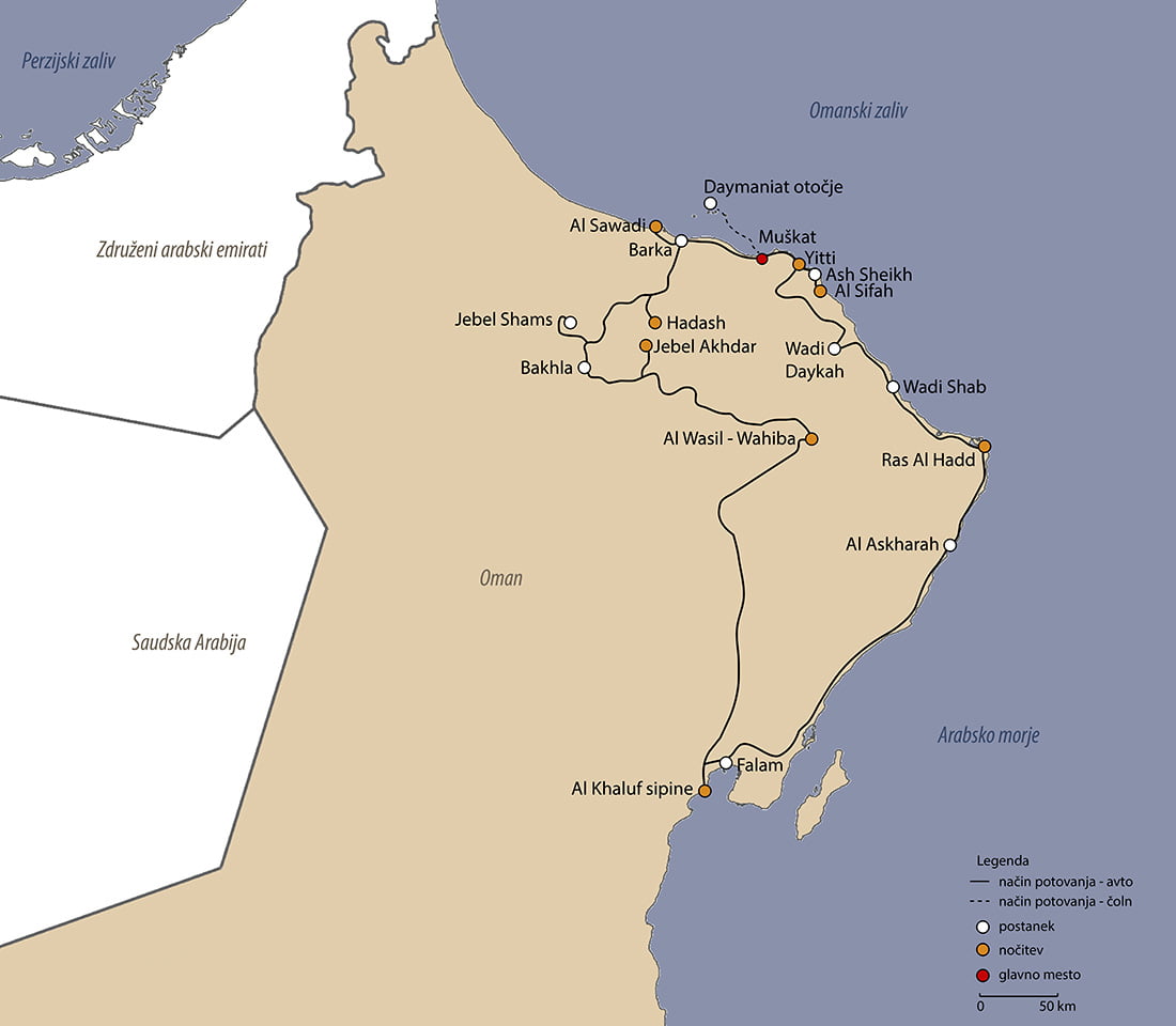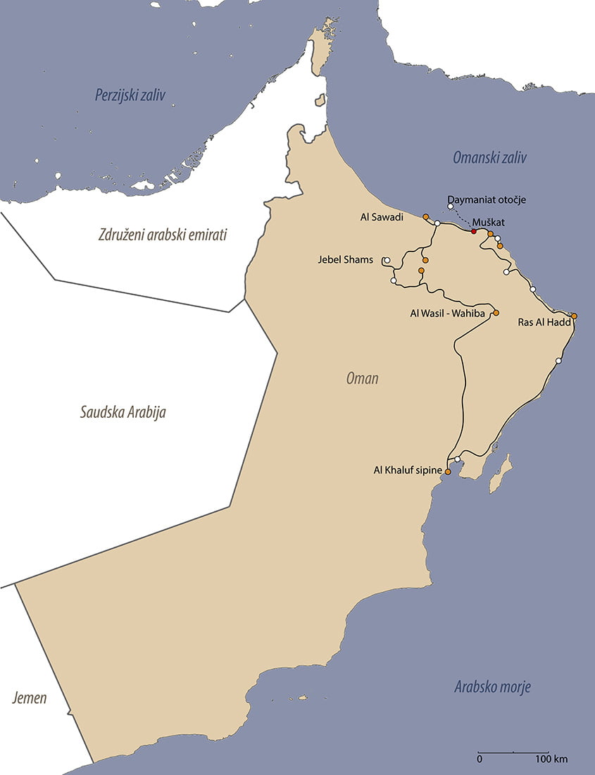 Oman je čudovita država na Arabskem polotoku, ki naju je pritegnila s svojo zanimivo in raznoliko naravo, možnostjo divjega kampiranja in zanimivimi plezalnimi smermi. V Oman sva potovala konec meseca aprila in začetek maja za 10 dni. Že doma sva vedela, da bova na potovanju divje kampirala, zato sva najela terensko vozilo (Toyota LandCruiser) – da sva lahko prišla do najboljših lokacij za prenočevanje, s seboj pa prinesla šotor in vso potrebno kamping opremo. Načrt potovanja Oman predstavlja najin izlet po dnevih, s povezavami do objav na blogu o posameznih zanimivostih in vključuje prevožene kilometre ter stroške – cene so zapisane v evrih, po tečaju, ki sva ga bila deležna, kar je približno 1 OR (omanski rial) = 2,5€.