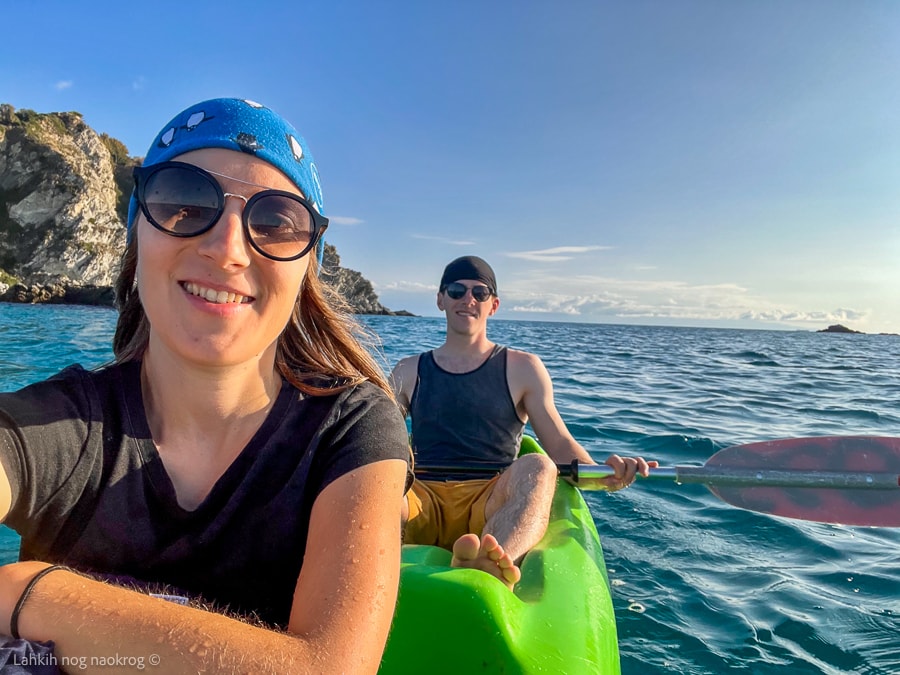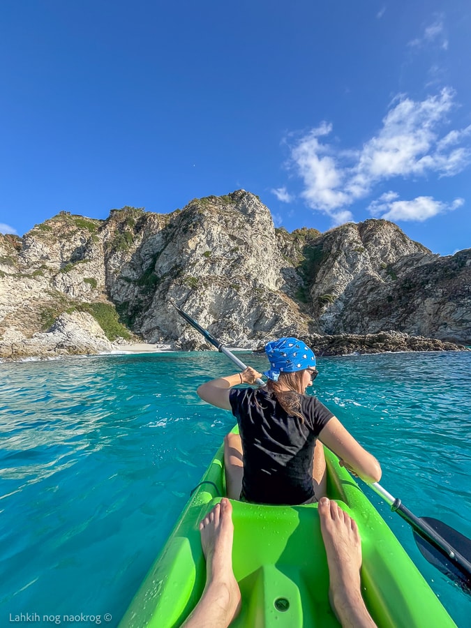 Kot omenjeno, sva par dni počivala in se razvajala v resortu, preostanek pa sva izkoristila za aktivno raziskovanje Kalabrije. Lahko bi bila seveda še bolj aktivna, najela avto, se vozila naokoli, ampak nisva. Vseeno sva si rekla, da bo to bolj dopust oz. tako sproščeno potovanje. Želela sva videti rt Capo Vaticano, ki je znan po razgibani obali, številnih lepih zalivčkih in zanimivih skalnih strukturah. Tale resort je bil praktično čisto blizu teh zalivčkov, a zaradi bližajočega konca sezone dnevnih izletov niso več organizirali. Lahko bi šla na izlet iz Tropee, ampak če sva bila tako blizu, no. V sosednjem kampu sva si izposodila kanu in kar sama odveslala do prvega zalivčka. Bilo je lepo, a morje precej razburkano, tako da naju je v majhnem kanuju skoraj “skipalo”. Posledično nisva šla ravno daleč in priznam, da bi bil izlet iz Tropee vseeno boljša ideja.